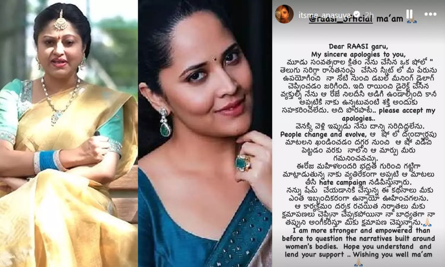 ఆ షో లో రాశిఫలాలు అని అనసూయ కామెంట్ చేశారని, అప్పుడే ఆమెపై న్యాయపరంగా వెళ్లాలనుకున్నానని, కానీ తన తల్లి చెప్పడంతో సైలెంట్ గా ఉన్నానని రాశీ చెప్పారు. రాశీ చేసిన కామెంట్స్ నెట్టింట వైరలవుతున్న టైమ్ లో ఆ వీడియోపై స్పందిస్తూ అనసూయ ఓ పోస్ట్ పెట్టారు. ఆ పోస్ట్ లో తాను మూడేళ్ల కిందట చేసిన ఓ షో లో తెలుగు సరిగా రానితనంపై చేసిన స్కిట్ లో రాశి పేరుని వాడి తన నోటి నుంచి డబుల్ మీనింగ్ డైలాగ్ చెప్పించారని, అలా రాయించిన వారిని అప్పుడే ఎదిరించాల్సిందని, కానీ అప్పుడు తనకున్న శక్తి సహకరించలేదని, అది తప్పేనని, దానికి సారీ చెప్తున్నానని రాసుకొచ్చారు అనసూయ. ఆ షో లో డబుల్ మీనింగ్ డైలాగ్స్ ను ఖండించడం నుంచి ఆ షో నుంచి తప్పుకునేవరకు తనలో ఎంత మార్పొచ్చిందో మీరు చూడొచ్చని, అయినా సరే ఆ విషయంలో తాను చేసింది తప్పు కాబట్టి ఆ షో డైరెక్టర్, రైటర్ మీకు సారీ చెప్పినా చెప్పకపోయినా, తన బాధ్యతగా మాత్రం తన తప్పును ఒప్పుకుంటూ క్షమాపణ చెప్తున్నానని అనసూయ పోస్ట్ చేయగా, ఈ పోస్ట్ ప్రస్తుతం నెట్టింట వైరల్ అవుతుంది.