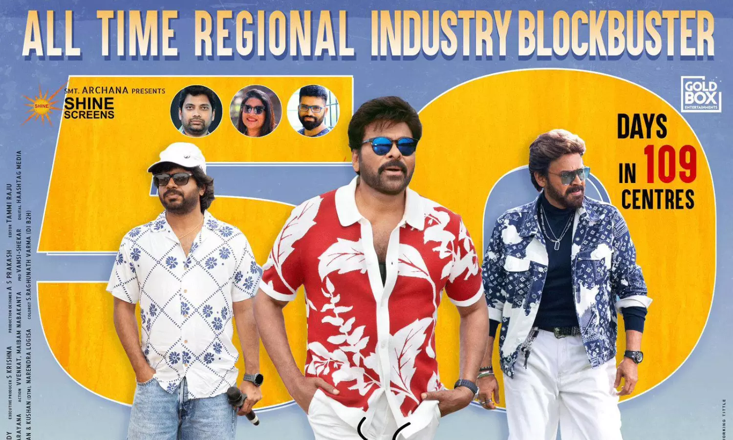అనిల్ రావిపూడి దర్శకత్వంలో వచ్చిన ‘మన శంకర వరప్రసాద్ గారు’ బాక్సాఫీస్ దగ్గర ఓ రికార్డ్ ని అందుకుంది. ఈ సినిమా ఏకంగా 109 సెంటర్లలో 50 రోజులు పూర్తి చేసుకుని అందరినీ ఆశ్చర్యపరిచింది. అసలు ఇలాంటి పోస్టర్ చూసి ఎంత కాలం అయ్యిందో కదా అని నెటిజన్లు కూడా సోషల్ మీడియాలో చర్చించుకుంటున్నారు. నేటి ఓటీటీ కాలంలో కూడా 100కు పైగా కేంద్రాల్లో 50 రోజులు ఆడటం అంటే అది మెగాస్టార్ మాస్ పవర్కు నిదర్శనమనే చెప్పాలి.