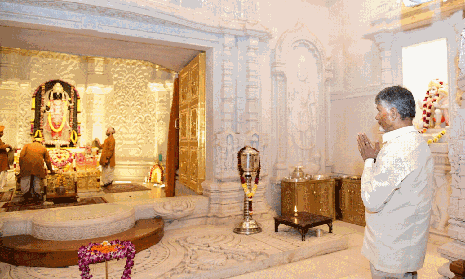 కాగా... ఏపీ ముఖ్యమంత్రి చంద్రబాబు ఈ రోజు ఉదయం హైదరాబాద్ (బేగంపేట) విమానాశ్రయం నుంచి అయోధ్యకు బయలుదేరి రామాయలయాన్ని సందర్శించారు అని ముఖ్యమంత్రి కార్యాలయం వెల్లడించింది. ఈ పర్యటనలో భాగంగా ఏపీ ముఖ్యమంత్రి ఉదయం 11:30 గంటల నుంచి మధ్యాహ్నం 2:30 గంటల అరకూ ఆలయ ప్రాంగణంలో గడిపి.. తిరిగి విజయవాడకు బయలుదేరారు.త సంవత్సరం అత్యంత వైభవంగా జరిగిన బలరాముడి ప్రాణ ప్రతిష్ఠ వేడుకకు హాజరైన తర్వాత.. చంద్రబాబు ఈ ఆలయాన్ని సందర్శించడం ఇది రెండోసారి.