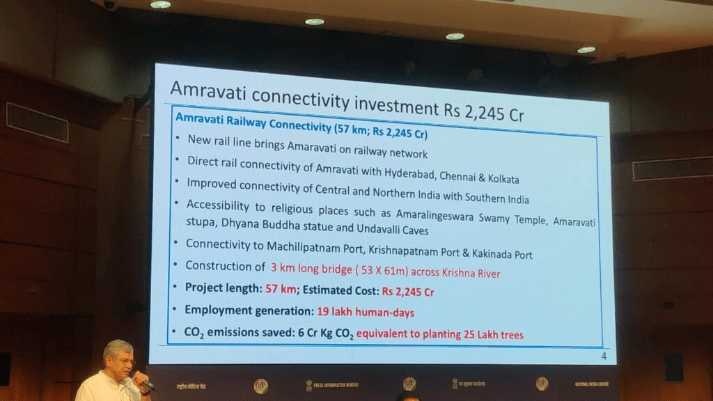 అమరావతికి కొత్త రైలు మార్గాన్ని కేంద్రం ప్రకటించింది. మొత్తం 57 కిలోమీటర్ల రైలు మార్గంతో అమరావతి రైలు ప్రాజెక్ట్ సాగనుంది. దీని కోసం కేంద్రం ఏకంగా 2,245కోట్ల రూపాయలను ఖర్చు చేయనుంది. ఈ విషయాన్ని కెంద్ర రైల్వే మంత్రి అశ్విని వైష్ణవ్ స్వయంగా ప్రకటించడంవిశేషం.