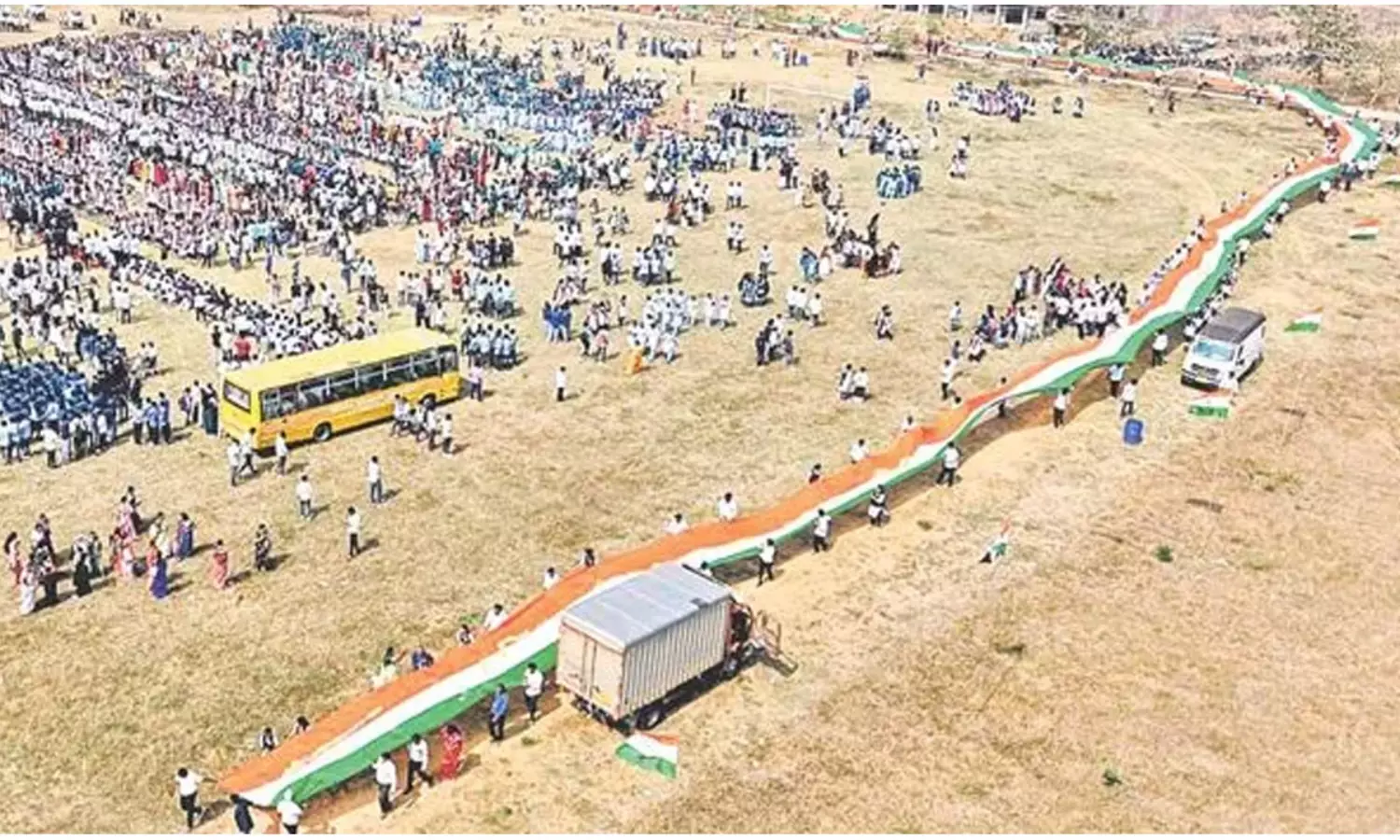 ఈ సందర్భంగా నిర్వహించిన ర్యాలీ అందరిని ఆకట్టుకుంటోంది. కిలోమీటర్ల పరిధిలో జాతీయ పతాకాన్ని వందల సంఖ్యలో పట్టుకున్న విద్యార్థుల వైనం అలరించింది.;