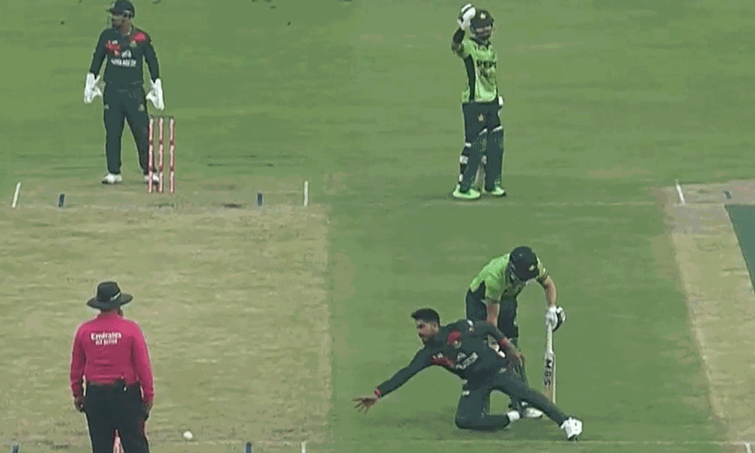 మెహదీ హసన్ మిరాజ్ వేసిన 39వ ఓవర్ లో పాక్ బ్యాటర్ మొహమ్మద్ రిజ్వాన్ కొట్టిన షాట్ కు బంతి వచ్చి నాన్ స్ట్రయికింగ్ లో ఉన్న ఆఘా బ్యాట్ కు తగిలింది.;