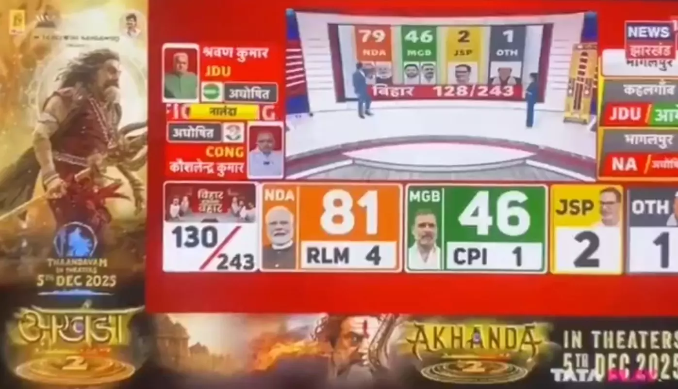 ప్రముఖ హిందీ న్యూస్ ఛానెళ్లు బీహార్ ఎన్నికల ఫలితాలను లైవ్లో విశ్లేషిస్తుండగా, స్క్రీన్ కింద, పక్కన భారీ యాడ్స్లో 'అఖండ 2' పోస్టర్లు స్పష్టంగా కనిపించాయి. బాలకృష్ణ అఘోరా గెటప్, సినిమా టైటిల్ "డిసెంబర్ 5న థియేటర్లలో" అనే రిలీజ్ డేట్ను జాతీయ స్థాయిలో కోట్లాది మంది ప్రేక్షకులకు ఒకేసారి చేరవేశారు.