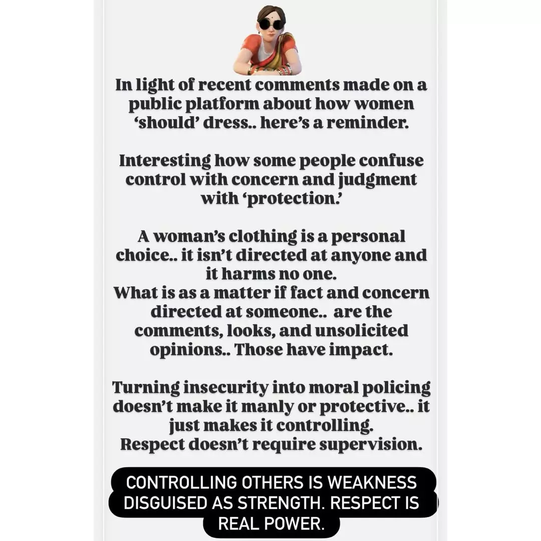 ఇన్స్టాగ్రామ్ స్టోరీలో ఆమె పెట్టిన ఒక ఇంగ్లీష్ నోట్ ఇప్పుడు నెట్టింట హాట్ టాపిక్ గా మారింది. డైరెక్ట్ గా శివాజీ పేరు ఎత్తకుండా ఆమె తన వివరణ ఇచ్చారు. పబ్లిక్ ప్లాట్ ఫామ్ మీద మహిళలు ఎలా డ్రెస్ చేసుకోవాలి అనే దానిపై రీసెంట్ గా వచ్చిన కామెంట్స్ ను ఉద్దేశించి అనసూయ ఈ పోస్ట్ పెట్టారు. ఇందులో ఆమె చాలా క్లియర్ గా, లాజికల్ గా తన పాయింట్స్ ను చెప్పారు. "కొంతమంది కంట్రోల్ చేయడాన్ని బాధ్యత గా, జడ్జ్ చేయడాన్ని రక్షణగా పొరబడుతుంటారని, ఇది గమనించాల్సిన విషయం" అని ఆమె స్ట్రాంగ్ గా చెప్పారు.