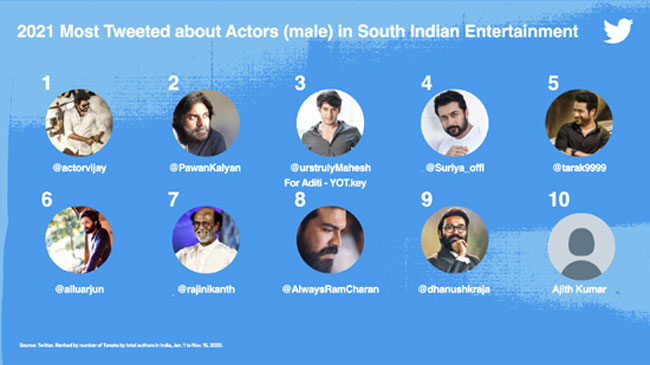 2021 మోస్ట్ ట్విట్టెడ్ హీరోల జాబితాను ట్విట్టర్ విడుదల చేసింది. ఈ టాప్ 10 జాబితాలో తమిళ హీరోలు అయిదు మంది తెలుగు హీరోలు అయిదు మంది ఉన్నారు. ఇదే సౌత్ సినీ ఇండస్ట్రీకి చెందిన కన్నడ మరియు మలయాళ స్టార్స్ కు ఈ జాబితాలో చోటు దక్కలేదు. నెం.1 స్థానంలో తమిళ సూపర్ స్టార్ విజయ్ నిలిచాడు.