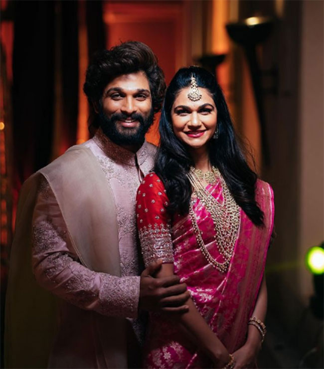 బాగా పెరిగిన తలకట్టు.. గుబురుగా పెంచిన గడ్డంతో బన్నీ ఎంత మాసీగా కనిపిస్తున్నాడో బ్యూటిఫుల్ స్మైల్ తో స్నేహ అంత క్లాసీగా కనిపిస్తున్నారు ఈ పిక్చర్ పర్ఫెక్ట్ ఫోటోలో. ఈ వేడుక ఆద్యంతం రకరకాల డిజైనర్ దుస్తుల్లో కనిపించింది ఈ జంట.