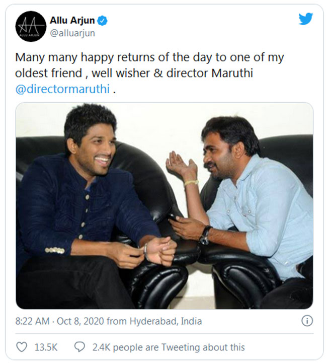 మారుతికి బన్నీ నుండి ప్రత్యేకంగా పుట్టిన రోజు శుభాకాంక్షలు అందాయి. నా ఓల్డెస్ట్ ఫ్రెండ్ మారుతికి పుట్టిన రోజు శుభాకాంక్షలు అంటూ బన్నీ ట్వీట్ చేశాడు. స్నేహితుడు అయిన మారుతికి బన్నీ పుట్టిన రోజు శుభాకాంక్షలు సోషల్ మీడియాలో వైరల్ అయ్యింది. అల్లు అర్జున్ బర్త్ డే శుభాకాంక్షలకు మారుతి స్పందిస్తూ.. థ్యాంక్యూ బన్నీ బాబు.. సో స్వీట్ ఆప్ యూ అంటూ ట్వీట్ చేశాడు. మారుతికి ఇంకా పలువురు సినీ ప్రముఖులు మరియు మీడియా వర్గాల వారు సైతం పుట్టిన రోజు శుభాకాంక్షలు తెలియజేశారు.