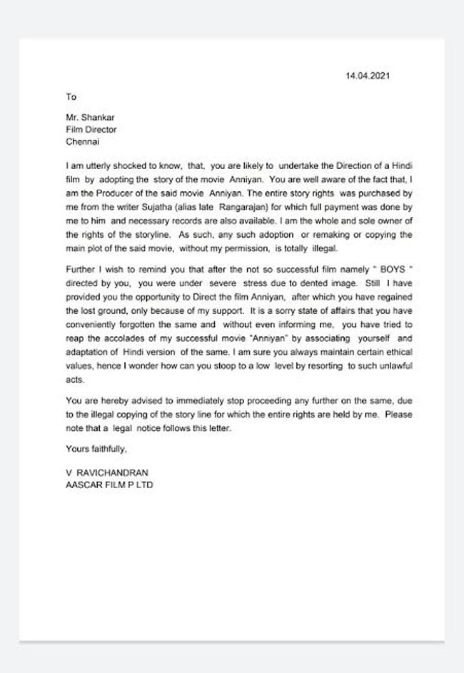 "డైరెక్టర్ శంకర్.. అన్నీయన్ అనే సినిమా కథతో ద్వారా మీరు హిందీలో రీమేక్ చేస్తున్నారని తెలిసి షాకయ్యాను. అన్నీయన్ చిత్రానికి నిర్మాత నేనే అనే విషయం మీకు బాగా తెలుసు. మొత్తం కథపరంగా అన్ని హక్కులను రచయిత సుజాత (అలియాస్ దివంగత రంగరాజన్) నుండి నేను కొనుక్కున్నాను. అందుకోసం నేను రచయితకు పూర్తి డబ్బులు చెల్లించాను. వాటి రికార్డులు కూడా నా దగ్గర ఉన్నాయి. అన్నియన్ కథ పై పూర్తి హక్కులు నావే. ఈ సినిమా విషయంలో నా అనుమతి లేకుండా మెయిన్ స్టోరీ లైన్ అనుసరించడం, రీమేక్ చేయడం లేదా కాపీ చేయడం పూర్తిగా చట్టవిరుద్ధం."