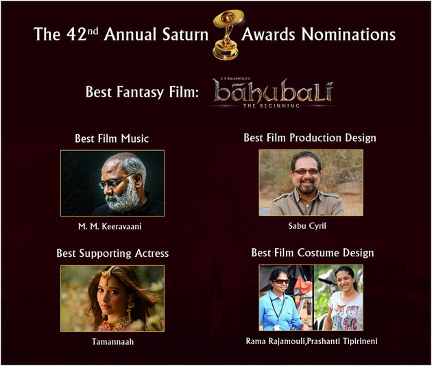ఇందులో బాహుబలికి ఐదు నామినేషన్లు లభించడం చెప్పుకోదగ్గ విషయం ఉత్తమ ఫ్యాంటసీ ఫిలిం - ఉత్తమ సహాయ నటి(తమన్నా) - ఉత్తమ ఫిలిం ప్రొడక్షన్ డిజైన్(సాబుసిరిల్) - ఉత్తమ ఫిలిం మ్యూజిక్(ఎంఎం కీరవాణి) - ఉత్తమ కాస్ట్యూమ్ డిజైన్(రమా రాజమౌళి) లకు నామినేషన్ లభించింది. కానీ,.. బాహుబలిని బెస్ట్ వీఎఫ్ ఎక్స్ కేటగిరీలో మాత్రం ఎంపిక చేయకపోవడం ఆశ్చర్యకరం. అయితే.. బాహుబలి ది బిగినింగ్ లో ఉన్న వీఎఫ్ ఎక్స్ షాట్స్ మనకు కొత్తగా మెస్మరైజ్ చేస్తాయి కానీ.. ఈ అవార్డుల విషయంలో హాలీవుడ్ సినిమాలతో పోటీ పడాల్సి ఉంటుంది.