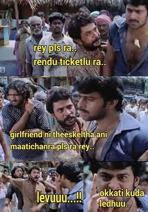 ఛత్రపతి సినిమాలో ఓ ఎమోషనల్ సన్నివేశం ఉంటుంది. అందులో ప్రభాస్-శేఖర్ మధ్యలో పీక్స్లో ఉండే సన్నివేశం ఒకటి ఉంది. సరిగ్గా ఆ ఫోటోల్ని కాప్చుర్ చేసి బాహుబలి ఫ్యాన్ ఎవరో ఓ ఇంట్రెస్టింగ్ కాన్సెప్టు తయారు చేశారు. ''రేయ్ ప్లీజ్ రా.. రెండు టిక్కెట్లురా''.. అని శేఖర్ ''గాళ్ ఫ్రెండ్ని తీసుకెళ్తానని మాటిచ్చానురా''.. అని ప్రభాస్ని అడుగుతుంటే.. ''లెవ్వు.. ఒక్కటి కూడా లేదు..'' అని ప్రభాస్ వేలెత్తి చూపిస్తున్న తీరు బోలెడంత ఫన్ క్రియేట్ చేస్తోంది.