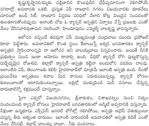 Balakrishna Wants lands for Basavatarakam Cancer Hospital and Trust