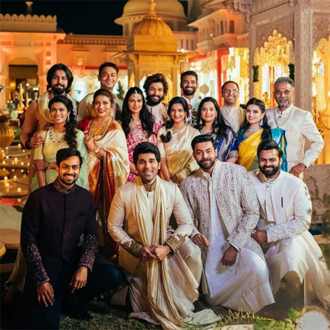 ఈ గ్రూప్ ఫోటోలో నాలుగు జంటలు.. నలుగురు యువహీరోలు ఎంతో సాంప్రదాయ బద్ధంగా డిజైనర్ డ్రెస్సుల్లో తళుక్కుమన్నారు. బన్ని-స్నేహ .. విష్ణు ప్రసాద్- సుస్మిత.. కళ్యాణ్ దేవ్ - శ్రీజ.. బాబి-నీలిమ జంటలు ఎంతో ఆకర్షణీయంగా కనిపిస్తుండగా.. యువహీరోలు వరుణ్ తేజ్- శిరీష్- సాయి తేజ్- వైష్ణవ్ తేజ్ .. ఫంక్ హెయిర్ స్టైల్ తో మెరిపించారు. ప్రఖ్యాత జోసెఫ్ రాధిక్ డిజైనర్ లుక్ ఇదని రివీలైంది.