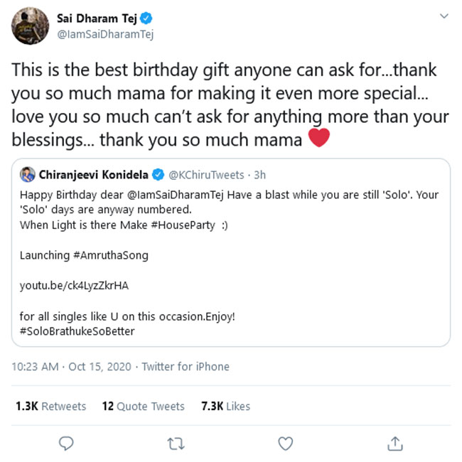 సాయి ధరమ్ తేజ్ తన మామయ్య బర్త్ డే విషెస్ కి ధన్యవాదాలు తెలిపాడు. ''ఇదే ఎవరైనా కోరుకునే బెస్ట్ బర్ డే గిఫ్ట్. ఈ రోజును మరింత ప్రత్యేకంగా మార్చినందుకు ధన్యవాదాలు మామ.. లవ్ వ్యూ సో మచ్. మీ ఆశీర్వాదం తప్ప మరేమీ అడగలేను. థాంక్యూ సో మచ్ మామా'' అని తేజ్ ట్వీట్ లో పేర్కొన్నాడు. కాగా,సుబ్బు దర్శకత్వంలో తెరకెక్కిన 'సోలో బ్రతుకే సో బెటర్' చిత్రాన్ని బీవీఎస్ఎన్ ప్రసాద్ నిర్మిస్తున్నారు. ఈ క్రమంలో తేజ్ 'ప్రస్థానం' దేవా కట్ట దర్శకత్వంలో ఓ సినిమాని స్టార్ట్ చేసాడు. దీంతో పాటు కార్తీక్ వర్మ దండు దర్శకత్వంలో ఓ మిస్టికల్ థ్రిల్లర్ లో నటించనున్నాడు. అంతేకాకుండా గోపాలకృష్ణ అనే కొత్త దర్శకుడితో తేజ్ 'భగవద్గీత సాక్షిగా' అనే ప్రాజెక్ట్ లైన్లో పెట్టారని వార్తలు వస్తున్నాయి.