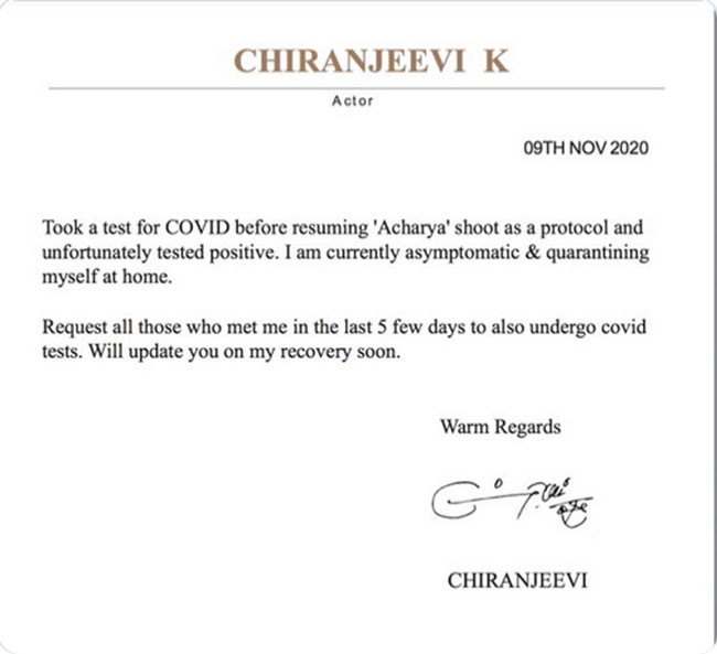 ''ఆచార్య షూటింగ్ ప్రారంభించాలని, కోవిడ్ టెస్ట్ చేయించుకున్నాను. రిజల్ట్ పాజిటివ్. నాకు ఎలాంటి కోవిడ్ లక్షణాలు లేవు. వెంటనే హోమ్ క్వారంటైన్ అయ్యాను. గత 4-5 రోజులుగా నన్ను కలిసిన వారందరిని టెస్ట్ చేయించుకోవాలిసిందిగా కోరుతున్నాను. ఎప్పటికప్పుడు నా ఆరోగ్య పరిస్థితిని మీకు తెలియచేస్తాను'' అని చిరంజీవి ట్వీట్ చేశారు. కాగా, మెగాస్టార్ చిరంజీవి ఇటీవల అక్కినేని నాగార్జునతో కలిసి తెలంగాణా ముఖ్యమంత్రి కేసీఆర్ ని కలిసిన సంగతి తెలిసిందే. అలానే ఎంపీ జోగినిపల్లి సంతోష్ కుమార్ మరియు రామ్ చరణ్ లు చిరంజీవితో కలిసి కాసేపు సమయం గడిపారు. ఇప్పుడు చిరంజీవిని కలిసిన వీరందరూ కరోనా టెస్టులు చేయించుకోవాల్సిన పరిస్థితి ఏర్పడింది.