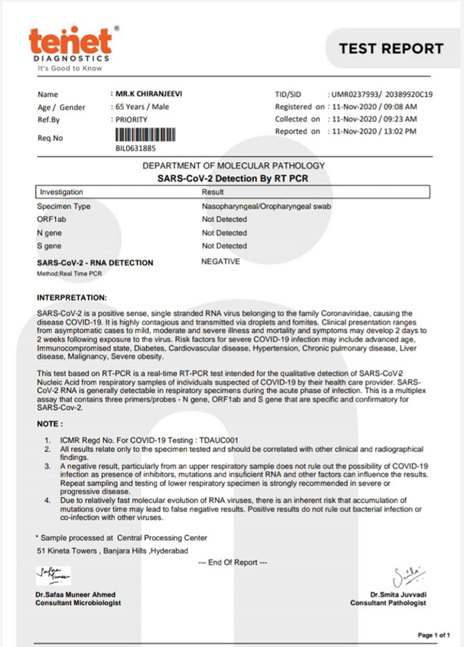 చిరు పాజిటివ్ కాదు.. మొదటి రిపోర్ట్ తప్పు