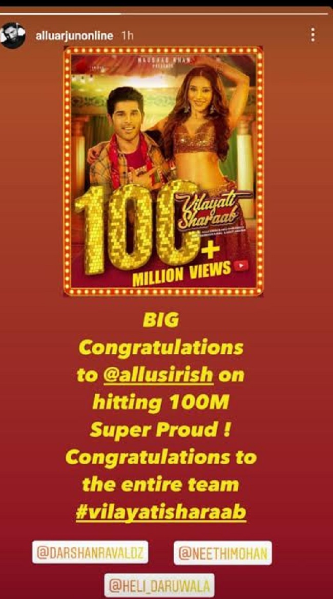 ''మీ పాట 100 మిలియన్ వ్యూస్ సాధించినందుకు బిగ్ కంగ్రాచ్యులేషన్స్ శిరీష్. చాలా గర్వంగా ఉంది. ఈ పాటకి పనిచేసిన ప్రతి ఒక్కరికి నా అభినందనలు'' అని బన్నీ ఇన్స్టాగ్రామ్ స్టోరీలో తెలిపాడు. ఈ సందర్భంగా అల్లు శిరీష్ సైతం తన ఆనందాన్ని పంచుకున్నాడు. ''విలాయటి షరాబ్ పాటపై ఇంతటి ప్రేమాభిమానాలు చూపించినందుకు మ్యూజిక్ లవర్స్ కి పెద్ద థ్యాంక్స్. 100 మిలియన్స్ వ్యూస్ సాధించి ఛార్ట్ లో టాప్ లో నిలవడం ఊహించలేకపోతున్నాను. టీమ్ అందరికి నా అభినందనలు'' అని పేర్కొన్నాడు.