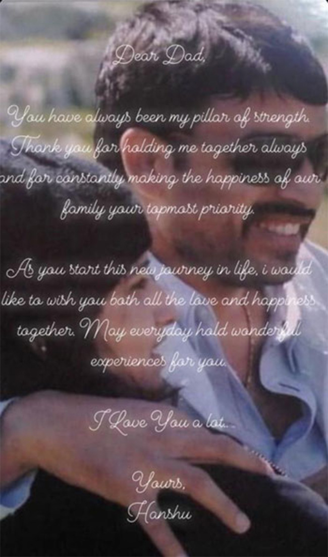 నాన్న పెళ్లి తర్వాత హన్షితా ఎమోషనల్ గా విషెష్ తెలియజేశారు. ఆమె... ప్రియమైన నాన్న అన్ని వేళల్లో నువ్వు నాకు తోడుగా నిలబడ్డావు. నువ్వే నాకు అతి పెద్ద బలం. నువ్వు ఎప్పుడూ నాకు అండగా ఉంటూ వచ్చినందుకు కృతజ్ఞతలు. మన కుటుంబం సంతోషం కోసం నువ్వు చాలా కష్టపడ్డావు. మా సంతోషమే నీకు ముఖ్యంగా అనుకున్నావు. జీవితంలో నువ్వు ప్రారంభించిన ఈ కొత్త ప్రయాణం సంతోషంగా సాగాలి. మీరిద్దరు ఎప్పుడూ కూడా సంతోషంగా ఉండాలని కోరుకుంటున్నాను. ప్రతి రోజు మీకు అద్బుతంగా సాగాలంటూ ఆశిస్తూ ఉన్నాను. ఐ లవ్ యూ అంటూ ఒక లేఖను రాశారు.