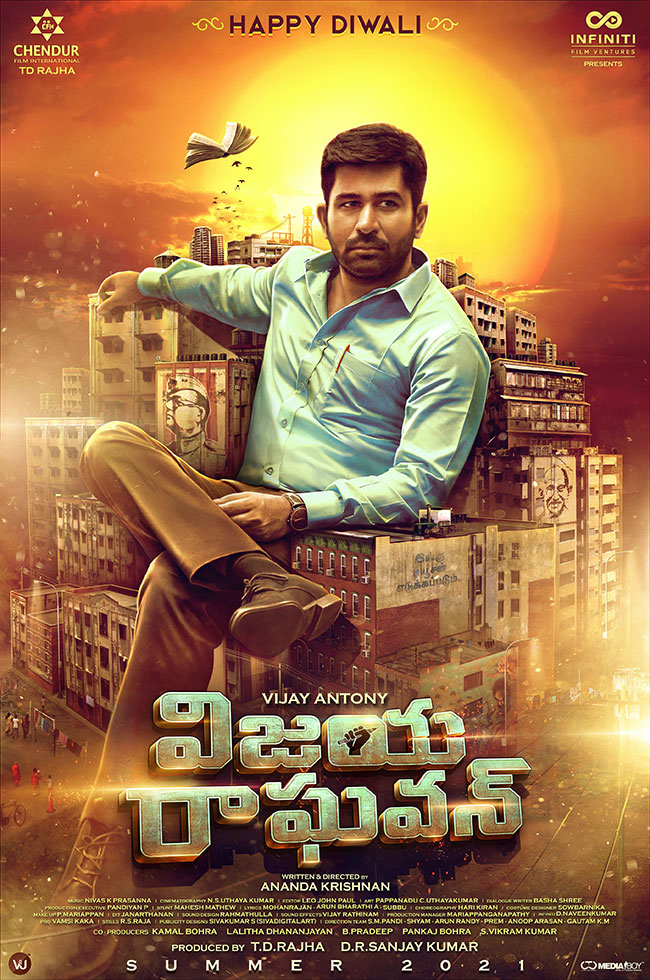 'విజయ రాఘవన్' ఫస్ట్ లుక్ లో నీట్ గా టక్ చేసుకున్న విజయ్ ఆంటోని ఎత్తైన భవనాల సముదాయంపై స్టైల్ గా కాలుపై కాలు వేసుకుని కూర్చున్నట్లుగా చూపించారు. ఇంటెన్స్ లుక్ తో విజయ్ ఆంటోని ఆకట్టుకుంటున్నాడు. బిల్డింగ్స్ పై నేతాజీ సుభాష్ చంద్రబోస్ మరియు గాంధీ ఫోటోలు కనిపిస్తున్నాయి. అలానే టైటిల్ డిజైన్ లో కలం పట్టుకొని పిడికిలి బిగించిన చేతి ముద్ర కూడా ఆసక్తిని కలిగిస్తోంది. తెలుగులో ఈ చిత్రాన్ని ఇన్ఫినిటీ ఫిల్మ్ వెంచర్ సమర్పణలో చెందూర్ ఫిల్మ్ ఇంటర్నేషనల్ బ్యానర్ పై టి.డి.రాజా - డి.ఆర్.సంజయ్ కుమార్ నిర్మిస్తున్నారు. ప్రస్తుతం చిత్రీకరణను జరుపుకుంటోన్న ఈ చిత్రాన్ని వచ్చే ఏడాది సమ్మర్ లో విడుదల చేయడానికి సన్నాహాలు చేస్తున్నారు.