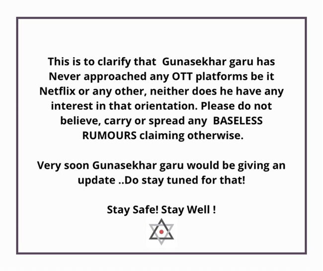 షూటింగ్ మొదలు పెట్టబోతున్న సమయంలో స్క్రిప్ట్ నచ్చలేదని గుణశేఖర్ కు వారు హ్యాండ్ ఇచ్చారని.. బడ్జెట్ విషయంలో నెట్ ఫ్లిక్స్ వారు వెనక్కు తగ్గినట్లుగా వార్తలు వచ్చాయి. ఆ విషయమై సోషల్ మీడియాలో పెద్ద ఎత్తున ప్రచారం జరగడంతో గుణశేఖర్ టీం అధికారికంగా స్పందించింది. అసలు ఇప్పటి వరకు ఓటీటీ ప్లాట్ ఫామ్ తో గుణశేఖర్ చర్చలు జరిపిందే లేదు. ఆయనకు ఓటీటీపై ఆసక్తే లేదు అంటూ తెలియజేశారు. మీడియాలో వస్తున్న పుకార్లను ఎవరు నమ్మవద్దంటూ విజ్ఞప్తి చేశారు. త్వరలోనే గుణశేఖర్ తాను చేయబోతున్న సినిమా వివరాలను అధికారికంగా ప్రకటిస్తాడంటూ గుణ టీమ్ వర్క్స్ అధికారిక ట్విట్టర్ ఖాతాలో పేర్కొనడం జరిగింది.