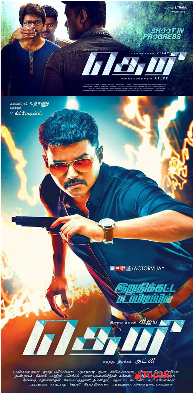 ఇకపోతే విజయ్ 59వ రూపొందుతున్న సినిమాను గతంలో 'రాజా రాణి' సినిమాతో డైరక్టర్ గా తొలి సినిమానే బ్లాక్ బస్టర్ తీసి తన టాలెంటును ప్రూవ్ చేసుకున్న అట్లీ డైరక్ట్ చేస్తున్నాడు. ఈ సినిమాకు తెరి అని నామకరణం చేశారు. ఈ సినిమా ఫస్ట్ లుక్ ను ఈరోజు సాయంత్రమే రిలీజ్ చేశారు. పోస్టర్లు యథావిథిగా కొత్తగా ఉండేలా చూసుకున్నాడు విజయ్. ఒక పోస్టర్ లో అయితే ఏకంగా మూడు రకాల రోల్స్ పోషిస్టున్నట్లు డిజైన్ చేశారు. ఒక క్యారెక్టర్ పోలీస్ ఆఫీసర్ అనుకుంట. అభిమానులు మాత్రం ఈ లుక్ రిలీజ్ అయిన మరుక్షణం నుండి పండగ చేసుకుంటున్నారంతే.