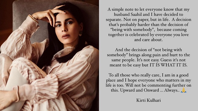 ''నేను నా భర్త సాహిల్ విడిపోవాలని నిర్ణయించుకున్నాం. మా జీవితంలో ఎవరి దారి వారు చూసుకోవాలని డిసైడ్ అయ్యాం. కలిసి ఉండాలని అనుకోవడం కన్నా.. విడిపోయే నిర్ణయం తీసుకోవడం చాలా కష్టం. ఎందుకంటే.. కలిసి జీవించినప్పుడు అందరూ స్వాగతిస్తారు. కానీ.. విడిపోవడానికి ఎవ్వరూ అంగీకరించరు. కానీ తప్పడం లేదు. దీని గురించి ఎవరూ ఎప్పటికీ కామెంట్ చేయొద్దు'' అంటూ పెద్ద పోస్టే రాశారు ఇన్ స్టా గ్రామ్ లో.
