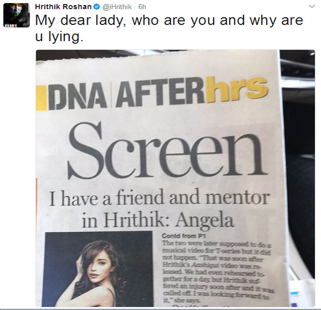 అందులో.. ‘‘డియర్ లేడీ.. అసలు ఎవరు నువ్వు? ఎందుకు అబద్ధాలు చెబుతున్నావు’’ అంటూ ప్రశ్నించాడు హృతిక్. దీంతో పాటుగా ఏంజెలా ఇంటర్వ్యూకు సంబంధించిన పేపర్ కటింగ్ కూడా షేర్ చేశాడు హృతిక్. దీంతో ఏంజెలా చెప్పినవన్నీ సొల్లు కబుర్లని తేలిపోయింది. హృతిక్ ఏమీ ఆటపట్టిస్తున్నట్లుగా కూడా లేదు. అతను ఈ వ్యవహారాన్ని సీరియస్ గానే తీసుకున్నట్లుంది. ఆల్రెడీ కంగనా రనౌత్ తో ఎదురైన అనుభవం దృష్టిలో ఉంచుకునో ఏమో.. తన ఇమేజ్ దెబ్బ తినకుండా జాగ్రత్త పడుతున్నట్లున్నాడు హృతిక్. మొత్తానికి హృతిక్ నువ్వెవరంటూ ప్రశ్నించడంతో ఏంజెలాకు తలకొట్టేసినట్లే అయి ఉంటుందిప్పుడు. ‘రోగ్’ ద్వారా ఆశించిన ప్రయోజనం దక్కకపోగా.. ఇప్పుడు హృతిక్ ఇలా గాలి తీసేయడం ఏంజెలాకు ఇబ్బందికర విషయమే.