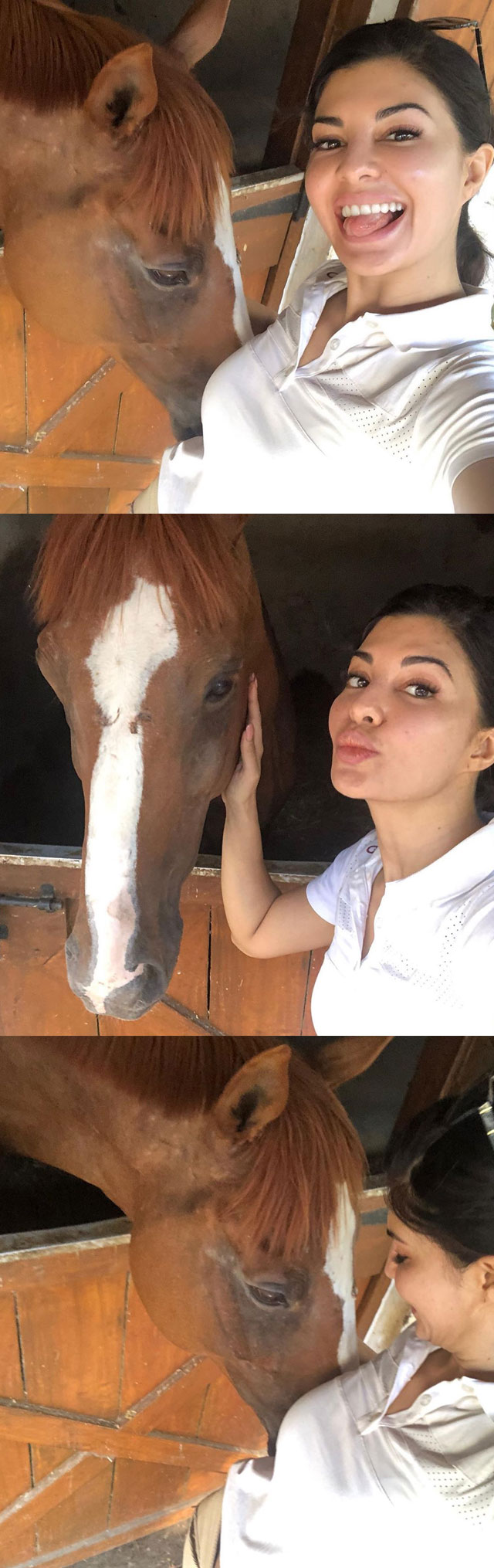 తాజాగా ఈ భామ తన ఇన్స్టా ఖాతా ద్వారా ఒక ఇంట్రెస్టింగ్ ఫోటో పోస్ట్ చేసింది. ఈ ఫోటోకు "జంతువులన్నిటినీ హర్యానా హైకోర్టు 'చట్టపరమైన వ్యక్తులు' గా డిక్లేర్ చేసింది. పౌరులందరూ ఈ జంతువులకు గార్దియన్స్ అంటూ ప్రకటించింది. పశు సంక్షేమానికి సంబంధించి ఇదొక చారిత్రాత్మకమైన తీర్పు. నా స్నేహితులైన నాలుగు కాళ్ళ జీవుల విషయంలో నేను చాలా సంతోషంగా ఉన్నాను" అంటూ జాక్వెలిన్ క్యాప్షన్ ఇచ్చింది. ఈ ఫోటోలో ఒక గుర్రం జాక్వెలిన్ ను తాకుతూ మొహం పెట్టింది. జాక్వెలిన్ ఆ అందమైన గుర్రంతో సెల్ఫీ తీసుకుంటూ అల్లరి భామలాగా తన నాలుక బయట పెట్టింది.