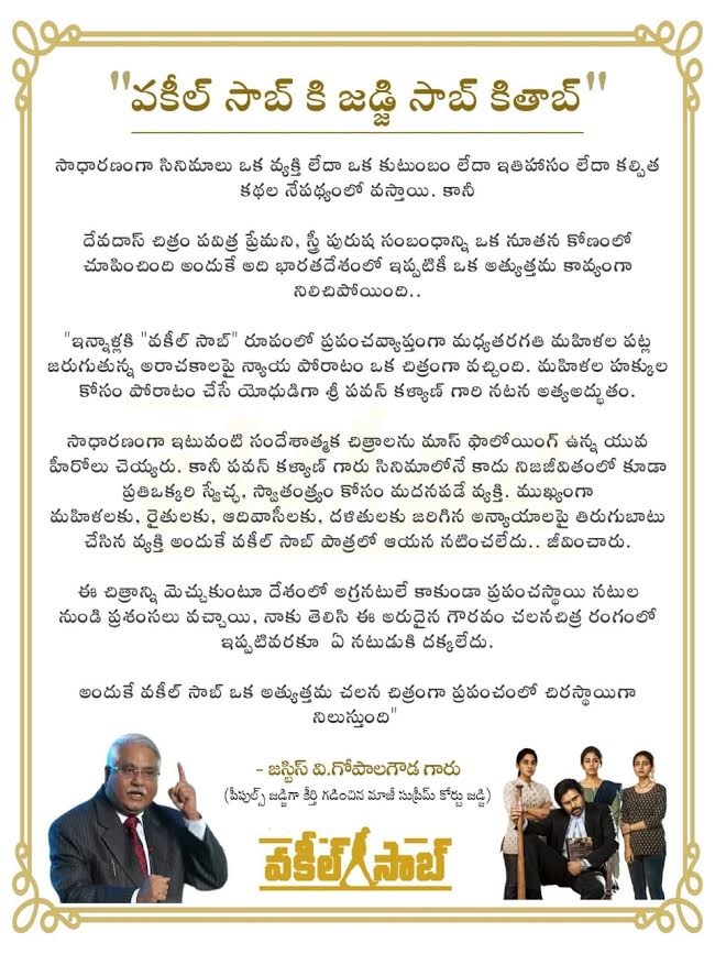 ''సాధారణంగా సినిమాలు ఒక వ్యక్తి లేదా ఒక కుటుంబం లేదా ఇతిహాసం లేదా కల్పిత కథల నేపథ్యంలో వస్తాయి. కానీ 'దేవదాస్' చిత్రం పవిత్ర ప్రేమని, స్త్రీ పురుష సంబంధాన్ని ఒక నూతన కోణంలో చూపించింది అందుకే అది భారతదేశంలో ఇప్పటికీ ఒక అత్యుత్తమ కావ్యంగా నిలిచిపోయింది. ఇన్నాళ్లకి 'వకీల్ సాబ్' రూపంలో ప్రపంచవ్యాప్తంగా మధ్యతరగతి మహిళల పట్ల జరుగుతున్న అరాచకాలపై న్యాయ పోరాటం ఒక చిత్రంగా వచ్చింది. మహిళల హక్కుల కోసం పోరాటం చేసే యోధుడిగా శ్రీ పవన్ కళ్యాణ్ నటన అత్యద్భుతం. సాధారణంగా ఇటువంటి సందేశాత్మక చిత్రాలను మాస్ ఫాలోయింగ్ ఉన్న యువ హీరోలు చెయ్యరు. కానీ పవన్ కళ్యాణ్ సినిమాలోనే కాదు నిజజీవితంలో కూడా ప్రతి ఒక్కరి స్వేచ్ఛ, స్వాతంత్ర్యం కోసం మదనపడే వ్యక్తి. ముఖ్యంగా మహిళలకు, రైతులకు, ఆదివాసీలకు, దళితులకు జరిగిన అన్యాయాలపై తిరుగుబాటు చేసిన వ్యక్తి అందుకే వకీల్ సాబ్ పాత్రలో ఆయన నటించలేదు.. జీవించారు. ఈ చిత్రాన్ని మెచ్చుకుంటూ దేశంలో అగ్రనటులే కాకుండా ప్రపంచస్థాయి నటుల నుండి ప్రశంసలు వచ్చాయి, నాకు తెలిసి ఈ అరుదైన గౌరవం చలనచిత్ర రంగంలో ఇప్పటివరకూ ఏ నటుడుకి దక్కలేదు. అందుకే వకీల్ సాబ్ ఒక అత్యుత్తమ చలన చిత్రంగా ప్రపంచంలో చిరస్థాయిగా నిలుస్తుంది" అని జస్టిస్ వి. గోపాలగౌడ ప్రకటనలో పేర్కొన్నారు.