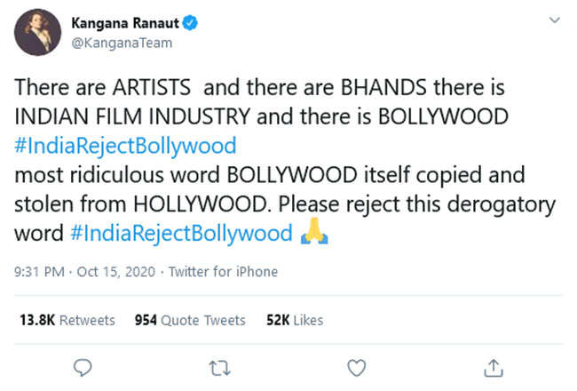 "భారతీయ చిత్ర పరిశ్రమలో ఆర్టిస్టులు కళాకారులతో పాటు బాలీవుడ్ ఇండస్ట్రీ కూడా ఉంది. చాలా హాస్యాస్పదమైన విషయమేమంటే బాలీవుడ్ అనే పదం హాలీవుడ్ నుండి కాపీ చేసి దొంగిలించబడింది. కాబట్టి దయచేసి అవమానకరమైన బాలీవుడ్ పదాన్ని తిరస్కరించండి'' అని #IndiaRejectBollywood హ్యాష్ ట్యాగ్ తో ఘాటుగా ట్వీట్ చేసింది కంగనా రనౌత్. ఈ వ్యాఖ్యలపై బాలీవుడ్ పెద్దలు ఎలా స్పందిస్తారో చూడాలి. కంగనా రనౌత్ ప్రస్తుతం తమిళనాడు దివంగత ముఖ్యమంత్రి జయలలిత బయోపిక్ 'తలైవి'లో నటిస్తోంది. ఈ సినిమా షూటింగ్ హైదరాబాద్ లో జరుగుతోంది.