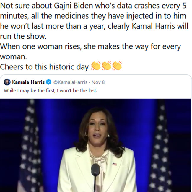 ఈ నేపథ్యంలో కమలా హారిస్ 'నేను ఫస్ట్ అయ్యుండొచ్చు.. కానీ నేను లాస్ట్ కాదు'' అని ట్వీట్ చేసింది. దీనికి స్పందించిన కంగనా 'జో బైడెన్ ఏడాదికి మించి బతకరని.. ఆ తర్వాత మొత్తం షో రన్ చేసేది వైస్ ప్రెసిండెంట్ కమలా హారిస్' అని వివాదాస్పద ట్వీట్ చేసింది. ''ప్రతి 5 నిమిషాలకు డేటా క్రాష్ అయిపోయే గజిని జో బైడెన్. ఆయనకు ఎక్కించిన మందుల వల్ల ఏడాదికి మించి బతుకుతారని అనుకోవడం లేదు. క్లియర్ గా కమలా హారిస్ షో రన్ చేస్తారు. ఒక మహిళ ఎదిగితే మరింత మంది మహిళలు ఎదిగేందుకు దోహదం చేస్తారు'' అని కంగనా రనౌత్ ట్వీట్ చేశారు.