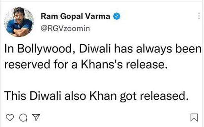 ఇప్పుడు ఖాన్ లపై అతడు వేసిన పంచ్ మామూలుగా లేదు. బాలీవుడ్ లో ఖాన్ లు ప్రతిసారీ దీపావళి రిలీజ్ కి కర్చీఫ్ వేసేస్తుంటారని ఈసారి దీపావళికి కూడా ఖాన్ రిలీజయ్యాడని తనదైన శైలిలో పంచ్ వేశాడు ఆర్జీవీ. ఇది ఎవరిని ఉద్ధేశించో గెస్ చేయాల్సిన పని లేదు. కచ్ఛితంగా కింగ్ ఖాన్ షారూక్ వారసుడు ఆర్యన్ ఖాన్ పైనే ఆర్జీవీ ఇలా స్పందించారని అర్థమవుతోంది. ఆర్యన్ కి నేడు కోర్ట్ బెయిల్ మంజూరు చేసిన సంగతి తెలిసిందే. ఆర్యన్ బాంద్రాలోని తన ఇంటికి రాగానే అభిమానులు డోలు భాజా మోగించి తమ ఆనందం వ్యక్తం చేసారు. ఇప్పటికే అనన్య పాండే .. షానయ కపూర్ సహా స్నేహితులు ఆర్యన్ ని కలిసారు.