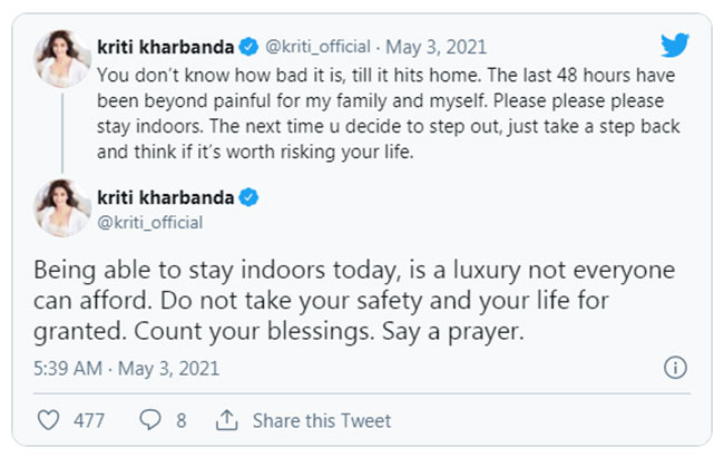 ట్విట్టర్ లో కృతి కర్బందా.. మీకు తెలియదు కరోనా అనేది మీ ఇంటికి వచ్చే వరకు అది ఎంత ప్రమాదకరమో. నేను మరియు నా కుటుంబ సభ్యులు 48 గంటల పాటు అనుభవించిన బాధ దారుణం. నరకం అనుభవించాం. అందుకే దయచేసి ఇంట్లోనే ఉండండి. మీరు బయటకు వెళ్లాలి అనుకున్నప్పుడు మీ పరిస్థితి మీ కుటుంబం పరిస్థితిని గురించి ఆలోచించండి. అత్యవసరం అయితే తప్ప బయటకు వెళ్లవద్దు. మీరు ఈ రోజు ఇంట్లో ఉంటేనే ముందు ముందు ఏ పని అయినా చేసుకునే వీలు ఉంటుందనే విషయాన్ని గుర్తుంచుకోండి అంటూ ఎమోషనల్ గా ట్వీట్ చేసింది.
