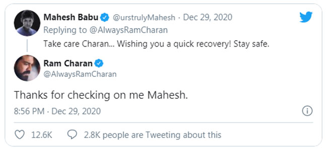 By: Tupaki Desk | 30 Dec 2020 11:27 AM ISTరామ్ చరణ్ ఇటీవలే కరోనా పాజిటివ్ అంటూ నిర్థారణ అయిన విషయం తెల్సిందే. కరోనా లక్షణాలు ఏమీ లేకపోవడంతో ఇంట్లోనే విశ్రాంతి తీసుకుంటున్నట్లుగా ఇటీవలే రామ్ చరణ్ సోషల్ మీడియాలో షేర్ చేశాడు. చరణ్ కు కరోనా అంటూ ట్వీట్ చేయగానే లక్షలాది మంది మెగా ఫ్యాన్స్ స్పందించారు. త్వరగా రికవరీ అవ్వాలంటూ ప్రార్థించారు. చరణ్ ఆరోగ్యం విషయమై మహేష్ బాబు స్పందించాడు. జాగ్రత్తగా ఉండు చరణ్.. నీవు చాలా స్పీడ్ గా కరోనా నుండి కోలుకోవాలని కోరుకుంటున్నాను అంటూ ట్వీట్ చేశాడు.
