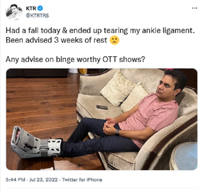 By: Tupaki Desk | 24 July 2022 10:35 AM ISTతెలంగాణ మంత్రి కేటీఆర్ ఎప్పుడు పార్టీ వ్యవహారాలు మరియు పరిపాలన వ్యవహారాలతో బిజీ బిజీగా ఉంటారు. ప్రతి రోజు మీటింగ్స్... పనులతో బిజీ బిజీగా ఉండే కేటీఆర్ ఇటీవల కాలికి చిన్న గాయం అయిన విషయం తెల్సిందే. ఆయన కాలికి అయిన గాయం తో మూడు వారాల పాటు పూర్తిగా విశ్రాంతి తీసుకోవాలని వైద్యులు సూచించారు. దాంతో ఈ సమయంలో ఓటీటీ సినిమాలు వెబ్ సిరీస్ లు ఏమైనా సజెస్ చేయండి అంటూ కేటీఆర్ ట్విట్టర్ ద్వారా పేర్కొన్నాడు.