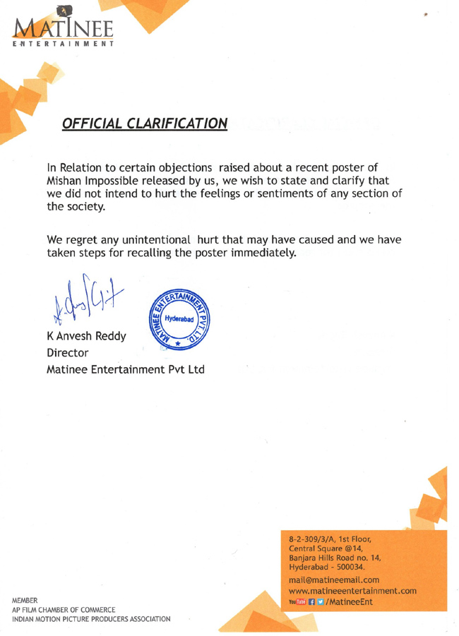 'మిషన్ ఇంపాజిబుల్' ఫస్ట్ లుక్ పోస్టర్ పై వ్యక్తమైన అభ్యంతరాలు మా దృష్టికి వచ్చాయని.. సమాజంలోని ఏ వర్గం యొక్క ఫీలింగ్స్ సెంటిమెంట్స్ ని హర్ట్ చేయాలనే ఉద్దేశ్యంతో ఆ పోస్టర్ డిజైన్ చేయలేదని.. అనుకోకుండా జరిగిన ఈ విషయానికి చింతిస్తూ ఆ పోస్టర్ ని వెనక్కి తీసుకునేలా చర్యలు తీసుకుంటామని మేకర్స్ ట్విట్టర్ వేదికగా పేర్కొన్నారు. అయితే ఈ వివరణతో కూడా నెటిజన్స్ చల్లబడలేదు. మేకర్స్ కి వ్యతిరేకంగా కామెంట్స్ పెడుతూనే ఉన్నారు. మరి రాబోయే రోజుల్లో ఈ వివాదం ఎక్కడి దాకా వెళ్తుందో చూడాలి.