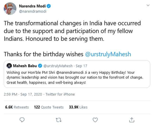 కాగా తనకు శుభాకాంక్షలు తెలిపిన ప్రతి ఒక్కరికి మోడీ పేరుపేరునా కృతజ్ఞతలు తెలిపారు.