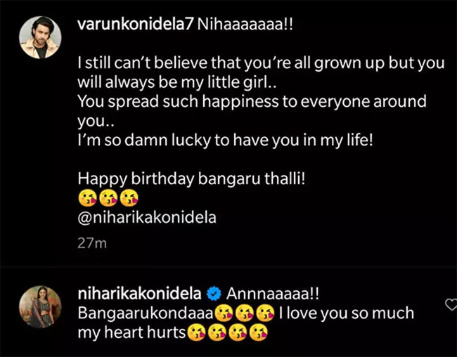 నిహారిక పుట్టిన రోజు సందర్బంగా వరుణ్ ట్విట్టర్ లో... నువ్వు అప్పుడే ఇంత పెద్ద అమ్మాయివి అయ్యావు అంటే నేను నమ్మలేక పోతున్నాను. అయినా కూడా నువ్వు నాకు ఎప్పటికి చిన్న పిల్లవే. నీ చుట్టు ఉన్న వారిలో ఎప్పుడు ఆనందాన్ని నింపుతూ వచ్చావు. నీవు నా జీవితంలో ఉన్నందుకు నేనెంతో లక్కీ.. హ్యాపీ బర్త్ డే బంగారు తల్లి అంటూ ఒక తండ్రి లాగా ట్వీట్ చేశాడు. వరుణ్ ట్వీట్ కు నిహారిక స్పందించింది. అన్నా... బంగారు కొండ ఐ లవ్ యు సో మచ్ అంటూ ముద్దుల ఈమోజీలు కురిపించింది.