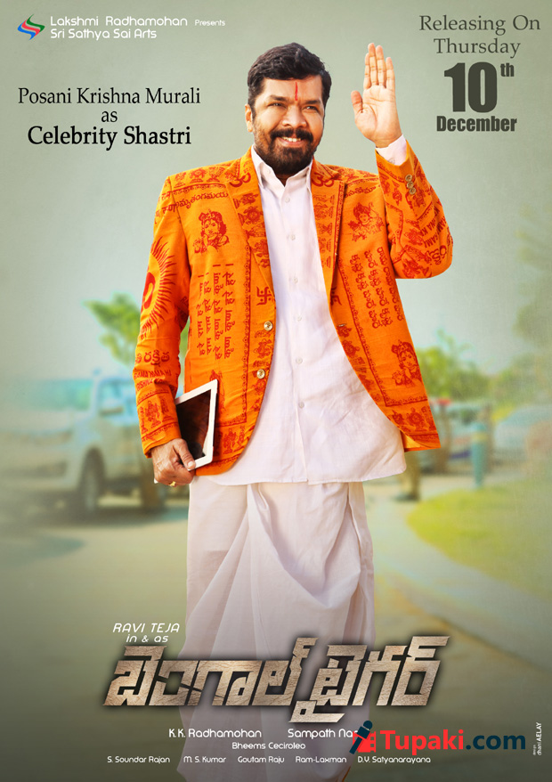 లేటెస్టుగా రవితేజ- సంపత్ నంది కాంబినేషన్ లో తెరకెక్కి ఈ నెల 10న రిలీజవుతున్న బెంగాల్ టైగర్ మూవీలో పోసాని ఓ ఇంట్రెస్టింగ్ క్యారెక్టర్ లో నటించాడు. సెలబ్రిటీ శాస్ర్తి అనేది క్యారెక్టర్ నేమ్. తెల్లని చొక్కా - పంచె కట్టు - వైట్ అండ్ వైట్ మీద ఓంకార నామాలు - పిల్లనగ్రోవి పట్టిన కృష్ణుడి బొమ్మలతో ఓ పసుపు రంగు కోటు ధరించి ఊరిమీదకి బయల్దేరే క్యారెక్టర్ ఇది. నుదిటిమీద నిలువెత్తు తిలకం దిద్ది ఎదుటివారికి సోప్ వేసేవాడిలాగా కనిపిస్తున్నాడు పోసాని. సెలబ్రిటీలందరికీ మోక్షం కావాలి. కాబట్టి అదేదో నేనే ఇస్తా అన్నట్టే కనిపిస్తోంది వాలకం. మరి ఈ క్యారెక్టర్ ఎవరి మీద సెటైర్? అన్నది తేలాల్సి ఉందింకా.