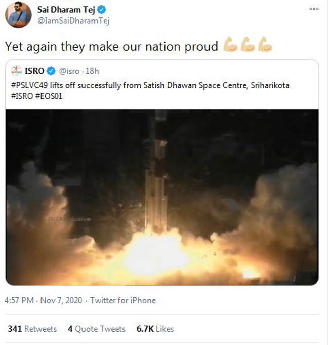 తాజాగా PSLVC49 ప్రయోగం విజయవంతమైంది. ఈ భారీ రాకెట్ ఉపగ్రహ ప్రయోగం సతీష్ ధావన్ స్పేస్ సెంటర్ -శ్రీహరికోట నుంచి జరిగింది. ఈ సందర్భంగా ఇస్రో ఘనతను పలువురు సెలబ్రిటీలు కొనియాడారు. #ISRO #EOS01 అని ట్యాగ్ చేస్తూ సుప్రీం హీరో సాయిధరమ్ తేజ్ ఇస్రో బృందంపై ప్రశంసలు కురిపించారు. ఇస్రో ట్విట్టర్ లో పోస్ట్ చేసిన వీడియోని అభిమానులకు షేర్ చేసి.. ``దేశం గర్వించదగ్గ మరో ప్రయోగమిది`` అని సాయి తేజ్ ప్రశంసించారు.