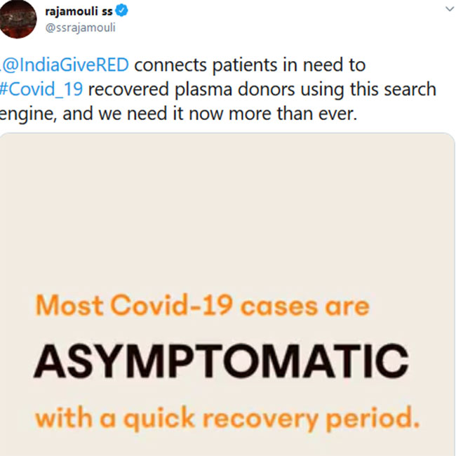 తాజాగా ఆర్.ఆర్.ఆర్ దర్శకుడు ఎస్.ఎస్.రాజమౌళి ముందుకొచ్చారు. కొవిడ్ -19 తో పోరాడి వైరస్ భయం నుంచి విజయవంతంగా బయటపడిన వ్యక్తులు దానం చేసిన రక్త ప్లాస్మా వైరస్ సోకిన ఇతర రోగుల చికిత్సలో గేమ్ ఛేంజర్ గా ఉందని `ప్లాస్మా దానం చేయాల`ని ప్రాణాలతో బయటపడిన వారందరికీ సామాజిక మాధ్యమాల ద్వారా విజ్ఞప్తి చేశారు. కొవిడ్ 19 ఎవరికైనా రావొచ్చు. దానికి సిగ్గు పడాల్సినదేమీ లేదు. దయచేసి ప్రాణాలను కాపాడకుండా సామాజిక కళంకం తేవొద్దు. ప్లాస్మా దానం ఆపొద్దు.. మిమ్మల్ని మీరు నిరోధించవద్దు`` అని రాజమౌళి ట్వీట్ చేశారు. http://givered.in లో ప్లాస్మా దాతలు తమ పేర్లను నమోదు చేసుకోవాలని సూచించారు.