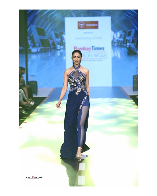 ఇదిలా ఉంటే.. తాజాగా రకుల్ ప్రీత్ సింగ్ బాంబే టైమ్స్ ఫ్యాషన్ వీక్ 2019 లో తళుక్కున మెరిసింది. ప్రముఖ ఫ్యాషన్ డిజైనర్ నరేంద్ర కుమార్ అహమద్ డిజైన్ చేసిన దుస్తుల్లో ర్యాంప్ వాక్ చేసింది. లెఫ్ట్ సైడ్ స్లిట్ ఉండే నీలం రంగు డ్రెస్ లో హొయలొలికిస్తూ ర్యాంప్ వాక్ చేయడంతో అక్కడున్నవారు ముగ్ధులైపోయారు. రెగ్యులర్ గా కసరత్తులు చేస్తూ స్లిమ్ గా ఉండే బ్యూటీ కావడం.. పైగా హీరోయిన్ గా మారక ముందు మోడలింగ్ రంగంలో అనుభవం ఉండడంతో ప్రొఫెషనల్ మోడల్ తరహాలో కనిపించింది. ఈ ఫ్యాషన్ వీక్ కు సంబంధించిన ఫోటోలను తన ఇన్స్టా గ్రామ్ ద్వారా పోస్ట్ చేయడంతో నెటిజనులకు ఫుల్లుగా లైకులు కొట్టారు.