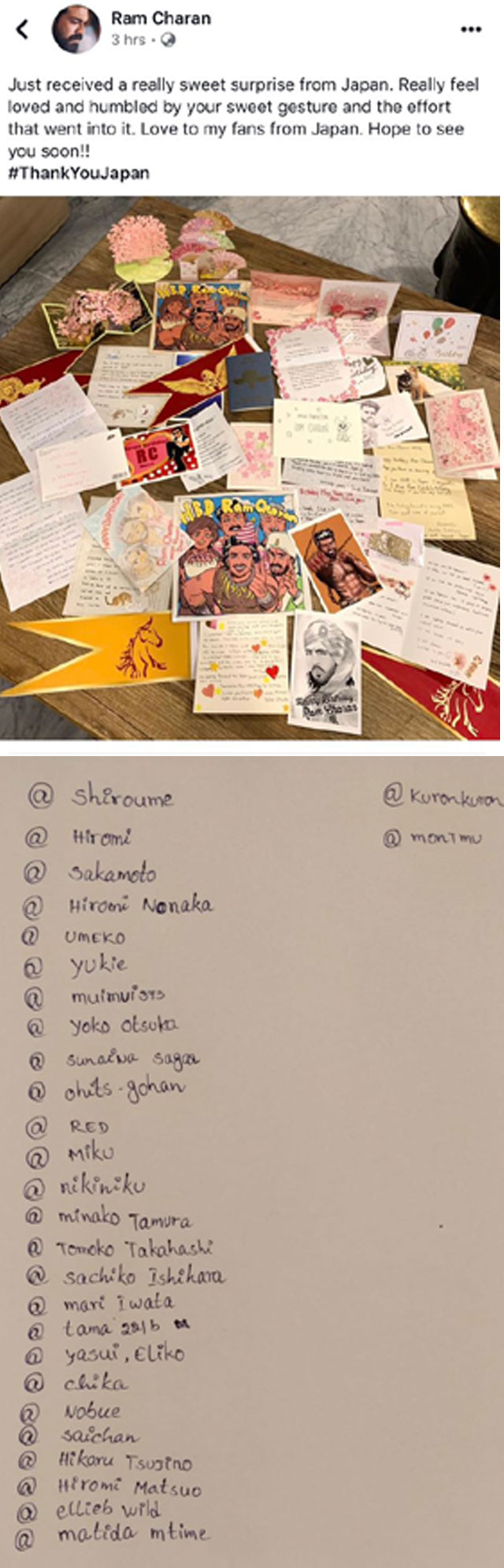 ఈ పరిణామం చూస్తుంటే.. చైనా.. జపాన్ మార్కెట్లను టార్గెట్ చేస్తున్న మన స్టార్లు అక్కడ క్రమంగా అభిమానుల్ని పెంచుకోవడంలోనూ పోటీ పడుతున్నారనే అర్థమవుతోంది. రజనీకాంత్ - ప్రభాస్ - రామ్ చరణ్ - రానా లకు జపాన్ లో అభిమానులున్నారు. ఇంకా ఈ లీగ్ లోకి ఇతర హీరోలు చేరే అవకాశం ఉంది. తాజాగా రామ్ చరణ్ కి జపనీ అభిమానులు లేఖలు రాయడం ప్రముఖంగా చర్చకు వచ్చింది. కొన్ని గ్రీటింగ్ కార్డ్స్ తరహాలో లేఖలు చరణ్ కి కొరియర్ లో అందాయిట. వీటిని ఉపాసన రామ్ చరణ్ స్వయంగా ట్విట్టర్ ద్వారా అభిమానులకు షేర్ చేశారు. చరణ్ ఈ లేఖలపై ఆనందం వ్యక్తం చేశారు. ``జపాన్ అభిమానుల నుంచి స్వీట్ సర్ ప్రైజ్ అందుకున్నా. మీ అభిమానానికి ధన్యవాదాలు. సాధ్యమైనంత తొందర్లోనే మిమ్మల్ని కలుసుకుంటాను..`` అని సామాజిక మాధ్యమాల్లో రిప్లయ్ ఇచ్చారు. ఈ లేఖల్లోనే రామ్ చరణ్ ని ఆర్ట్ గా డ్రా చేసి అభిమానం చూపారు కొందరు ఫ్యాన్స్. ఆ చిత్రలేఖనం నైపుణ్యానికి ఉపాసన ప్రశంసలు కురిపిస్తూ అభిమానానికి కృతజ్ఞతలు తెలిపారు. మిస్టర్ సి- నేను మీ ప్రేమాభిమానాలకు శిరస్సు వంచి నమస్కరిస్తున్నాం అని ట్వీట్ చేశారు ఉపాసన.