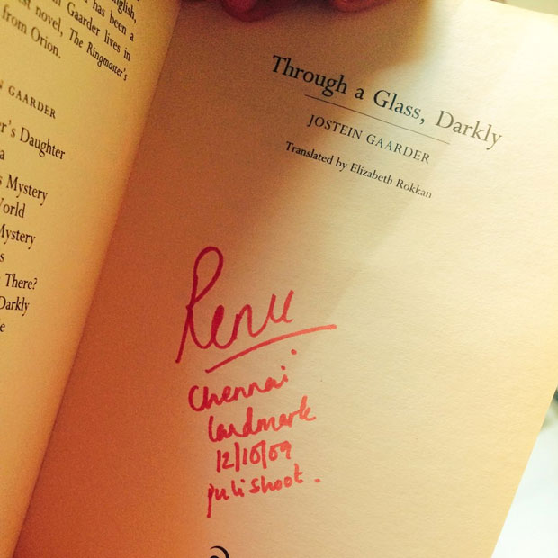 తన సంతకం, కొన్న ప్లేస్ కి గుర్తుగా చెన్నై, ఎక్కడ కొన్నానో గుర్తు కోసం ల్యాండ్ మార్క్ అని రాసుకుంది రేణు. అంతే కాదు.. తను పుస్తకం కొన్న డేట్ తో పాటు.. కొమరం పులి షూటింగ్ టైంలో అని కూడా మెన్షన్ చేసుకుంది. ఇంతకీ ఆ బుక్ పేరేంటో తెలుసా.. త్రూ ఏ గ్లాస్., డార్క్ లీ. ఇప్పుడా బుక్ ని ఓపెన్ చేస్తే.. అప్పుడు పవన్ తో కలిసి చెన్నైలో చక్కర్లు కొట్టిన సంగతులు గుర్తుకొస్తున్నాయని ఇన్ డైరెక్టుగా చెప్పింది రేణూ దేశాయ్.