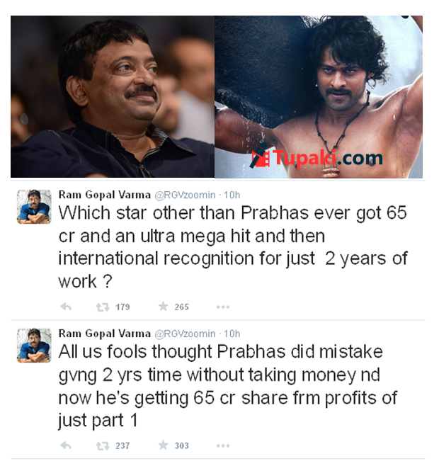 బాహుబలి ఇప్పటికే రూః200కోట్లకుపైగా వసూళ్లు సాధించింది. ఆ వసూళ్లు ఇంకా భారీగా పెరిగే అవకాశం కూడా ఉంది. అందుకే నిర్మాతలు ప్రభాస్కి సినిమాలో షేర్ ఇవ్వాలని నిర్మాతలు నిర్ణయించుకొన్నట్టు వర్మ ట్వీట్లను చూస్తే తెలుస్తోంది. ``ప్రభాస్ డబ్బులేమీ తీసుకోకుండా రెండేళ్లు కేటాయించాడని మాట్లాడుకొన్న మనమంతా ఫూల్స్. ఆయన తొలి పార్ట్కే 65కోట్ల షేర్ తీసుకొన్నాడు. ఇలా తీసుకొన్నవాళ్లు ఎవరున్నారో చూపించండి?`` అని ట్వీట్ చేశాడు వర్మ.