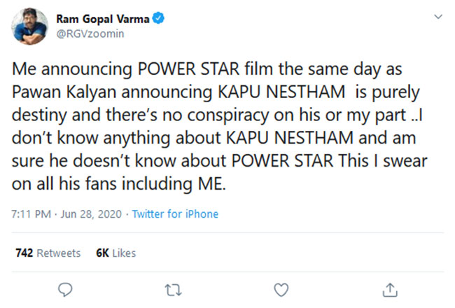 కాగా ఇప్పుడు అగ్నిపై ఆజ్యం పోసినట్లు మరో ట్వీట్ తో ముందుకొచ్చాడు రామ్ గోపాల్ వర్మ. ''పవన్ కళ్యాణ్ 'కాపు నేస్తం' ను ప్రకటించిన రోజునే నేను 'పవర్ స్టార్' సినిమాను ప్రకటించాను. ఇది డెస్టినీ మాత్రమే. దీంట్లో నా వైపు నుండి ఎలాంటి కుట్ర లేదు.. నాకు 'కాపు నేస్తం' గురించి ఏమీ తెలియదు. అలానే 'పవర్ స్టార్' గురించి ఆయనకు తెలియదని నేను ఖచ్చితంగా అనుకుంటున్నాను. ఇది నాతో సహా అతని అభిమానులందరిపై ప్రమాణం చేసి చెప్తున్నాను'' అని ట్వీట్ చేసారు. ఇలా పవన్ కళ్యాణ్ ని టార్గెట్ చేస్తూ వర్మ అటెన్షన్ కోరుకుంటున్నారని.. అతని సినిమాలు ఎవరూ చూడటం లేదని కనీసం మీడియాలో అయినా తన గురించి మాట్లాడుకుంటారని ఆర్జీవీ అనుకుంటున్నాడని పవన్ అభిమానులు కామెంట్స్ చేస్తున్నారు. ప్రస్తుతం వర్మ ట్వీట్స్ సోషల్ మీడియాలో వైరల్ అయ్యాయి.