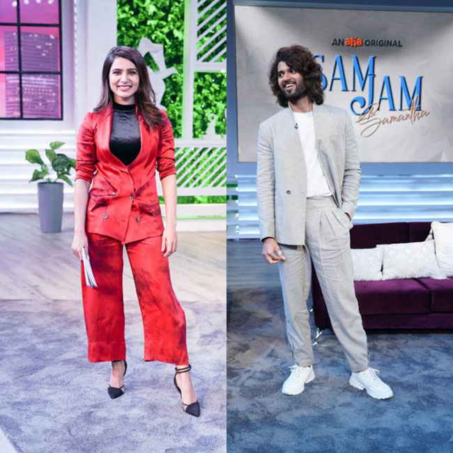 By: Tupaki Desk | 10 Nov 2020 3:40 PM ISTసమంత టాక్ షో సామ్ జామ్ స్ట్రీమింగ్ కు సిద్దం అయ్యింది. మొదటి ఎపిసోడ్ గా విజయ్ దేవరకొండ తో సమంత ఇంటర్వ్యూ ను ఆహాలో స్ట్రీమింగ్ చేయబోతున్నారు. సమంత మరియు విజయ్ దేవరకొండలు మంచి స్నేహితులు. వీరిద్దరు కూడా ఖచ్చితంగా ఆసక్తికర విషయాలు మాట్లాడుకుని ఉంటారు. వీరిద్దరి మద్య సాగిన గేమ్స్ మరియు సందడి చాలా హై లెవల్ లో ఉండి ఉంటుంది అంటూ సమంత అభిమానులు అటు విజయ్ దేవరకొండ అభిమానులు ఆ టాక్ షో కోసం ఎదురు చూస్తున్నారు. ఈ సమయంలో సామ్ జామ్ లో విజయ్ దేవరకొండ ఎలా కనిపించబోతున్నాడు అనే విషయమై క్లారిటీ ఇస్తూ ఫొటోలను షేర్ చేశారు.