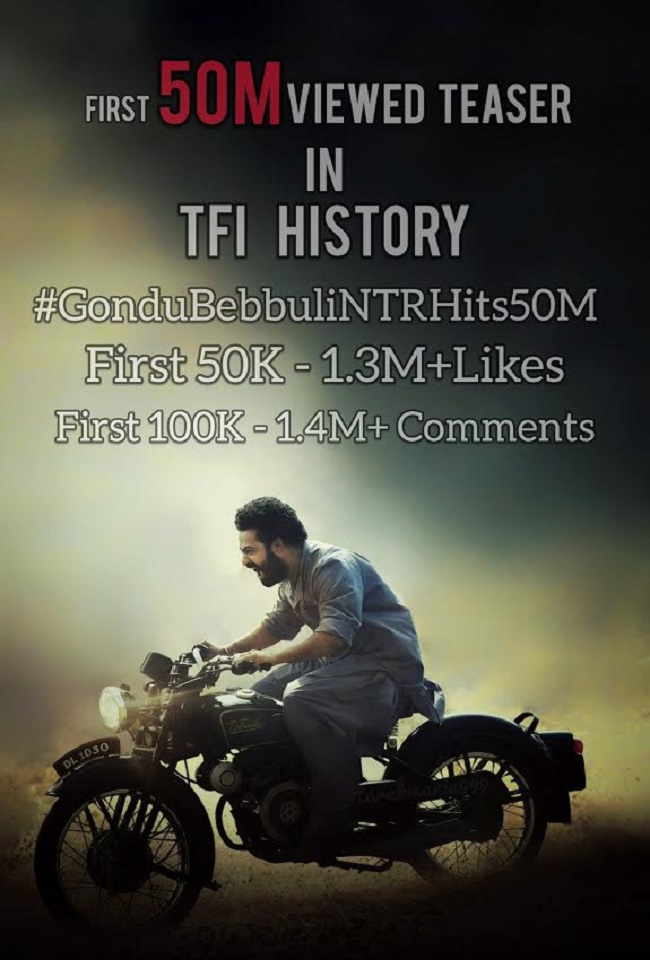 'ఆర్.ఆర్.ఆర్' చిత్రం నుంచి 2020 అక్టోబర్ 22న విడుదల చేయబడిన 'రామరాజు ఫర్ భీమ్' టీజర్ యూట్యూబ్ లో ఇప్పటి వరకు 50 మిలియన్లకు పైగా వ్యూస్ రాబట్టింది. ఈ నేపథ్యంలో టాలీవుడ్ ఫిలిం ఇండస్ట్రీలో 50M+ వ్యూస్ మార్క్ అందుకున్న మొట్ట మొదటి టీజర్ గా కొమురం భీమ్ ఇంట్రో వీడియో రికార్డ్ క్రియేట్ చేసింది. అంతేకాకుండా ఈ వీడియోకి 1.3M పైగా లైక్స్ మరియు 1.4M కామెంట్స్ వచ్చాయి. యూట్యూబ్ లో కొమురం భీమ్ హవా చూస్తుంటే టాలీవుడ్ లో ఇతర స్టార్ హీరోలకు భారీ టార్గెట్ ను నిర్దేశించడం ఖాయంగా కన్పిస్తోంది. ఈ నేపథ్యంలో ఎన్టీఆర్ ఫ్యాన్స్ సోషల్ మీడియాలో పెద్ద ఎత్తున హంగామా చేస్తున్నారు. '#GonduBebbuliNTRHits50M' హ్యాష్ ట్యాగ్ తో ట్విట్టర్ లో నేషనల్ వైడ్ ట్రెండ్ చేస్తున్నారు.