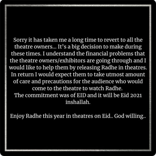 'రాధే' థియేట్రికల్ రిలీజ్ అవుతుంది: సల్మాన్