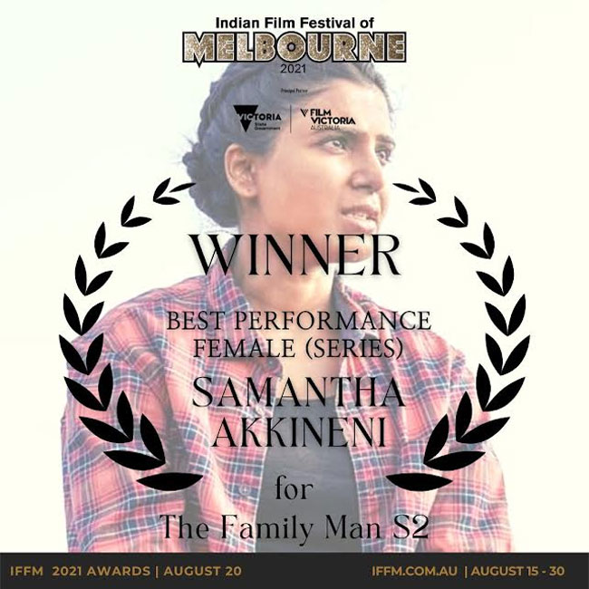 'ఫ్యామిలీ మ్యాన్ 2' సిరీస్ లో నటనకు గానూ ఇండియన్ ఫిల్మ్ ఫెస్టివల్ మెల్ బోర్న్-2021 లో బెస్ట్ పెర్ఫార్మెన్స్ ఫిమేల్ (సిరీస్) అవార్డుకు సమంత ఎంపికైంది. ఈ విషయాన్ని సోషల్ మీడియా వేదికగా వెల్లడిస్తూ.. IIFM టీమ్ సమంతకు అభినందనలు తెలిపారు. దీనిపై స్పందించిన సామ్.. ఫ్యామిలీ మ్యాన్ సృష్టికర్తలు రాజ్ & డీకే లకు కృతజ్ఞతలు చెప్పింది. "ఈ అవార్డుకు నన్ను ఎంపిక చేసినందుకు చాలా ధన్యవాదాలు. ఇది నిజంగా ప్రత్యేకమైనది. నా మీద విశ్వాసం ఉంచి.. నాకు మద్దతుగా నిలిచిన రాజ్-డికె లకు కృతజ్ఞతలు'' అని సామ్ ట్వీట్ చేశారు.