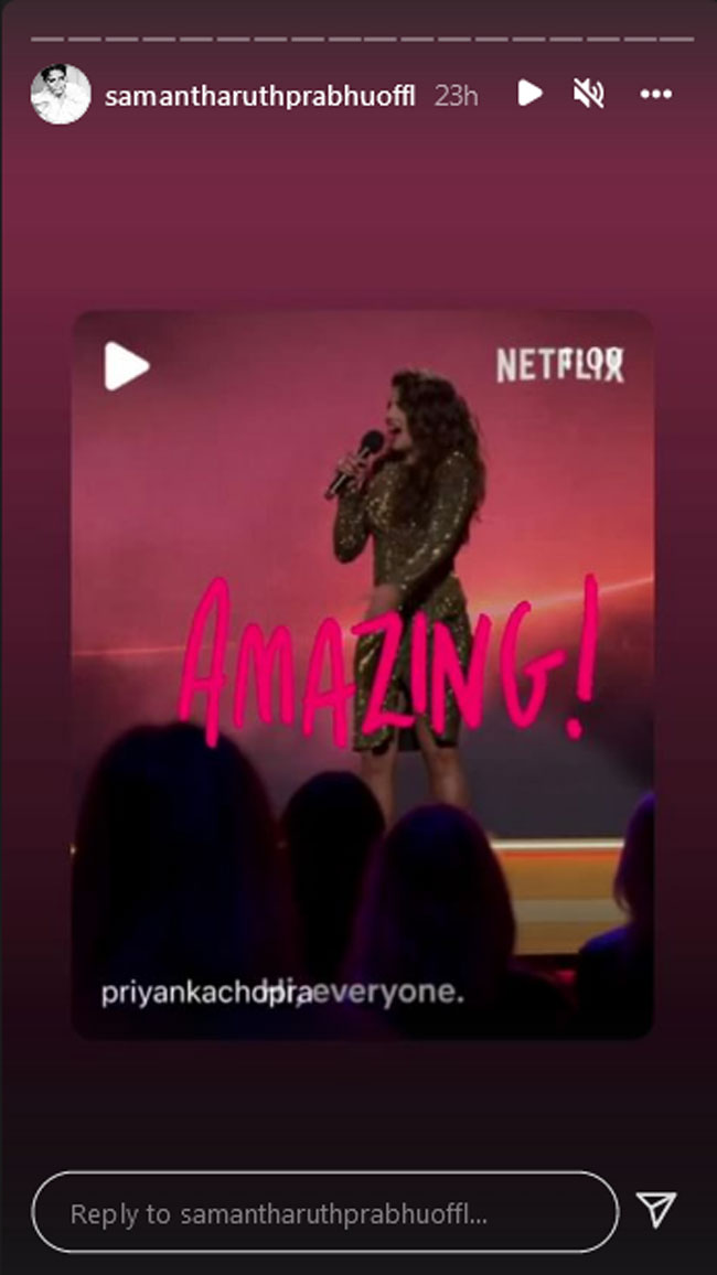 అయితే ప్రియాంక షేర్ చేసిన ఈ వీడియోపై ఇన్స్టాగ్రామ్ లో సమంత స్పందించారు. చోప్రా తన భర్తను రోస్టింగ్ చేయడాన్ని చూసి 'అమేజింగ్' అని కామెంట్ తో స్టోరీ పెట్టింది.
